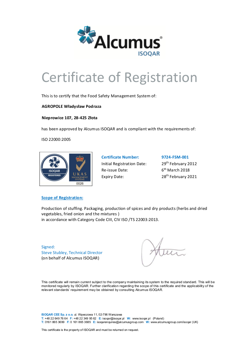 For our plant we successfully implemented ISO 22000 Food Safety Managment System.